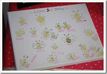 As guests entered the house, they saw this set up. The table had a canvas where everyone could put their thumb print and make a bee out of it and sign their name under it. The sign said, “Leave your print, sign your name…come on in, we’re so glad you came.”